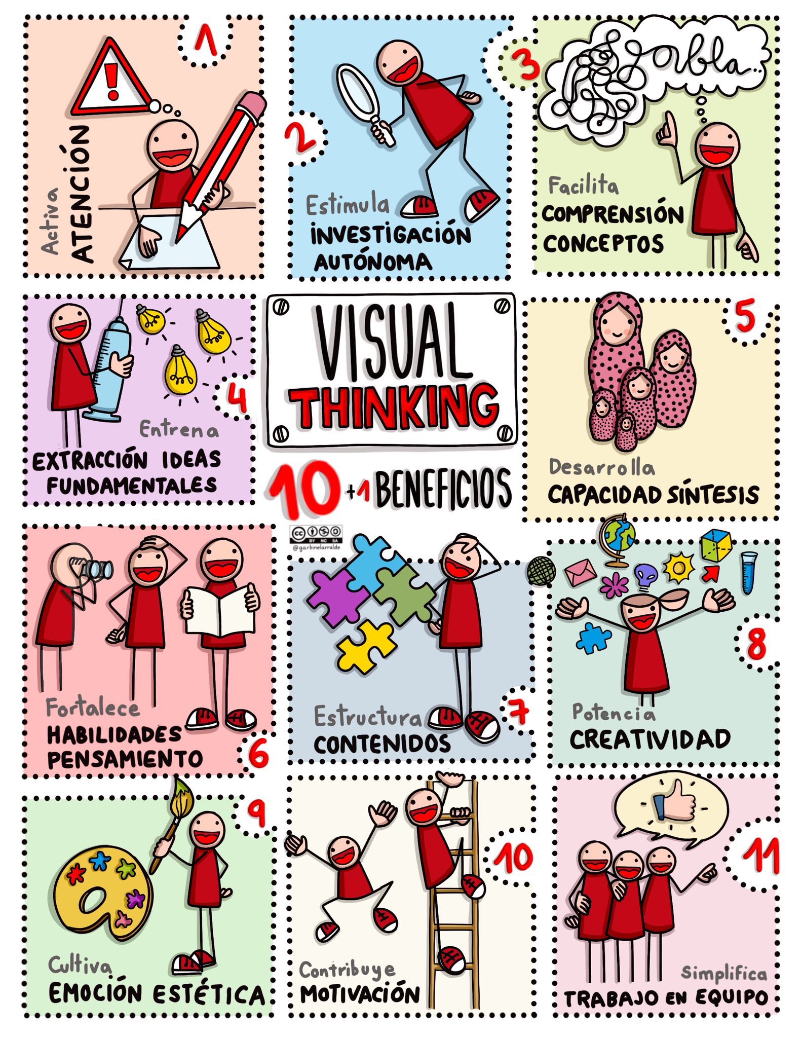 Según esta imagen de Garbiñe Larralde, hay 10 + 1 beneficios del Visual Thinking: